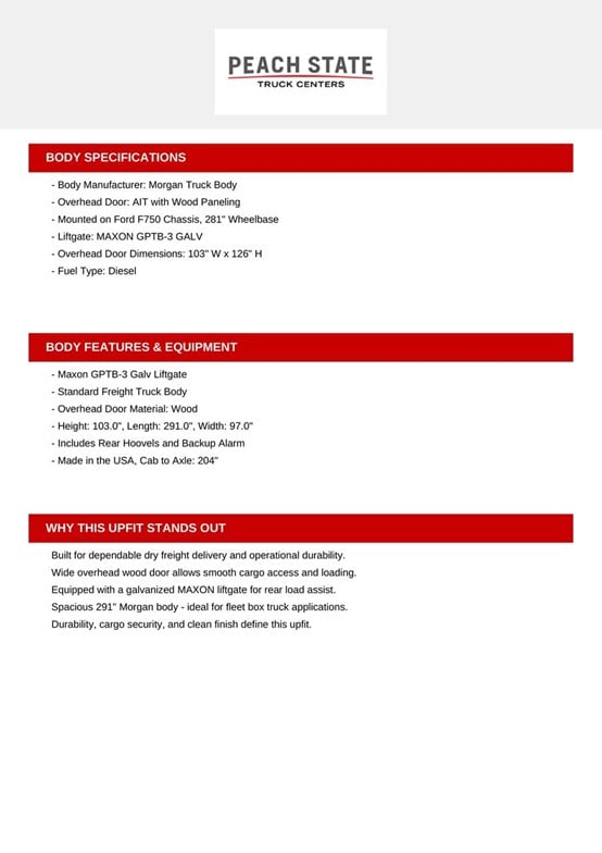 NEW!! 2025 Ford F-750 with 26FT Van Body & Liftgate, 6.7L Power Stroke Diesel, 10-speed auto, and 25,999 lb GVWR (No CDL Required). Equipped with a 26FT Morgan Van Body (102â€W x 103â€H), Maxon GTP-3 3,000 lb tuck-away liftgate, forklift package, 2 rows of E-track, and interior lighting. Features include rear view camera, chrome package, power group, 110V outlet, body builder wiring, and more. Ready for freight, moving, or delivery use. Extended warranty and financing available. Call Peach State Ford Truck Sales in Norcross, GA