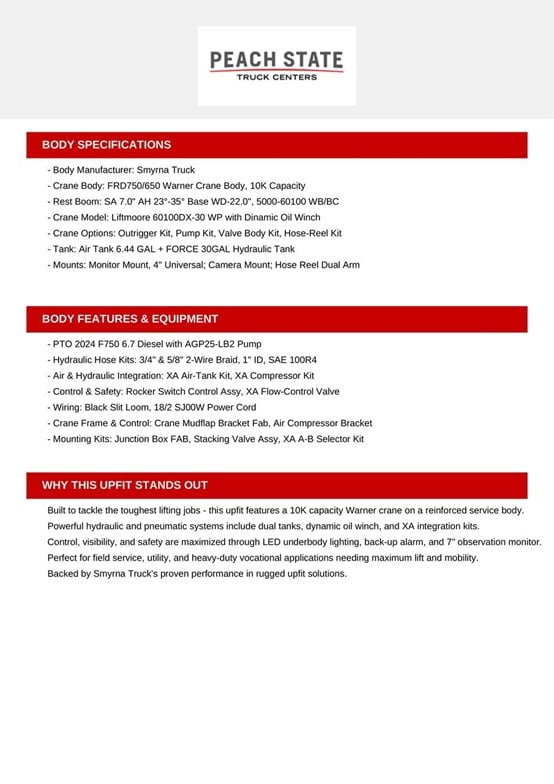 Priced To Sell!!! 50 State emissions! New Service Truck with Warner Service Body Package! Liftmoore 10K Crane, Boss BA440 Compressor, 6.7L Power stroke 330HP diesel, De-Rate (25,999 GVWR), Automatic transmission, preferred equipment package, 4 radio speakers, engine block heater, remote keyless entry, chrome front bumper, chrome grille, power equipment group, vertical exhaust, manual regen w/active regen inhibit,